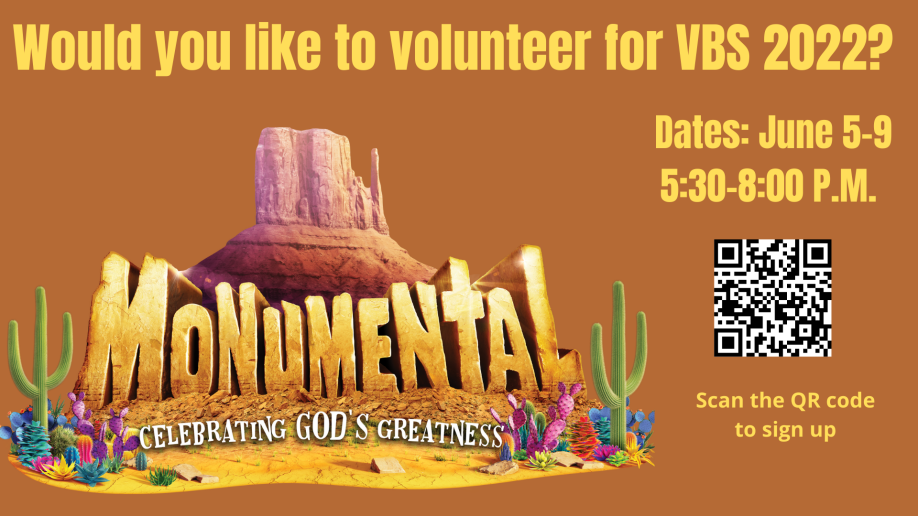 Want to volunteer to help with VBS? We have lots of places to serve!! Click the link below to register or scan the QR code with your smart phone!